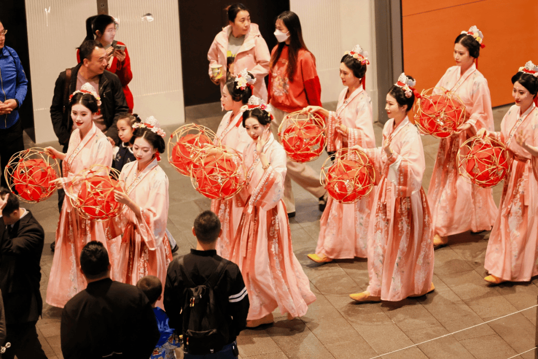 虹桥公园“虹运大集”活动创新融合传统与科技,“敦煌舞”“英歌舞”等民俗表演尽显古韵,“机器人舞蹈写福字”“机器狗贺岁”等互动项目则带来新奇体验。