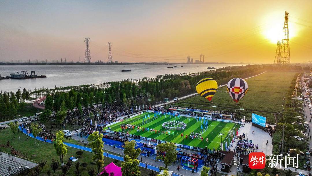 绿茵赛场激情澎湃,江畔风光岁月静好。来自各地的观众漫步在新合村江畔彩虹桥,欣赏长江日落,邂逅芦苇湿地,打卡世界最高输电铁塔,体验宝藏乡村的“诗与远方”。精彩比赛中,五彩斑斓的靖江本土品牌热气球带来浪漫氛围,展现出靖江低空经济活力;300架无人机编队以浩瀚夜空为幕,光影流转间将村超赛事主题、靖江特色名片一一铺展,勾勒出靖江乡村振兴、城市欣欣向荣的壮美图景。