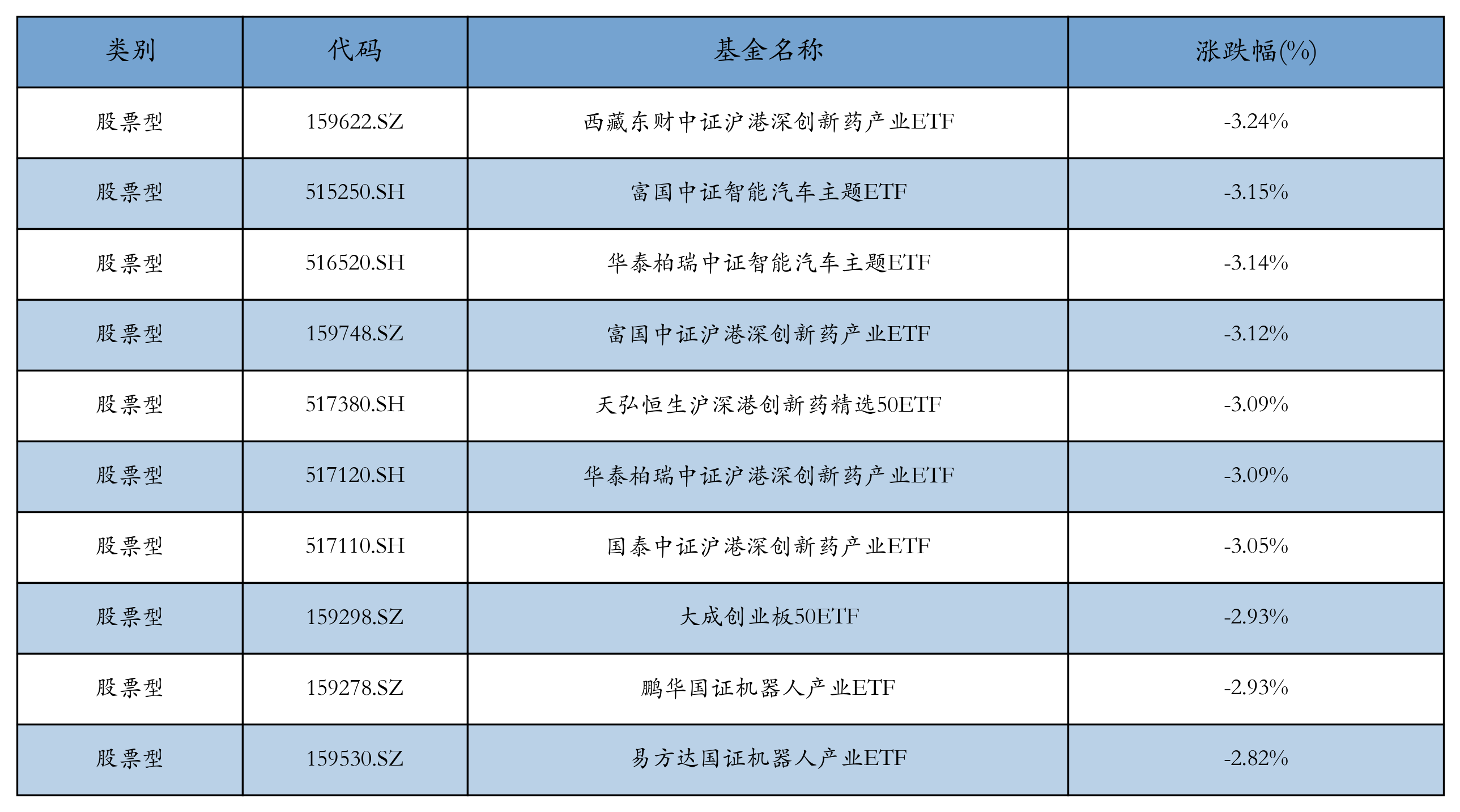 昨日股票型ETF跌幅最大的3支ETF及其收益率分别为:西藏东财中证沪港深创新药产业ETF(-3.24%)、富国中证智能汽车主题ETF(-3.15%)、华泰柏瑞中证智能汽车主题ETF(-3.14%)。跌幅前10详情见下表: