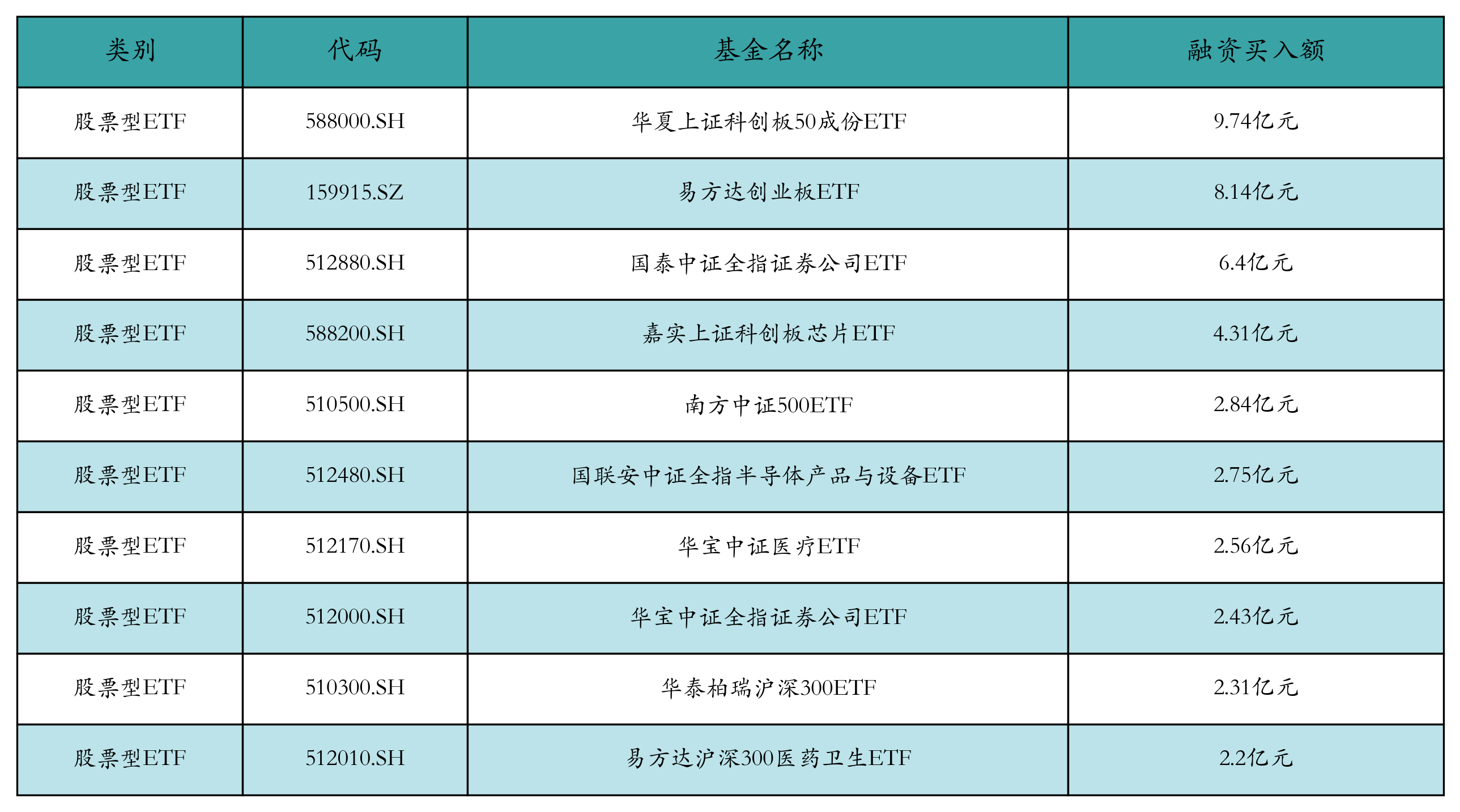 昨日股票型ETF融资买入额最高的3支ETF及其买入金额分别为:华夏上证科创板50成份ETF(9.74亿元)、易方达创业板ETF(8.14亿元)、国泰中证全指证券公司ETF(6.4亿元)。融资买入额前10详情见下表: