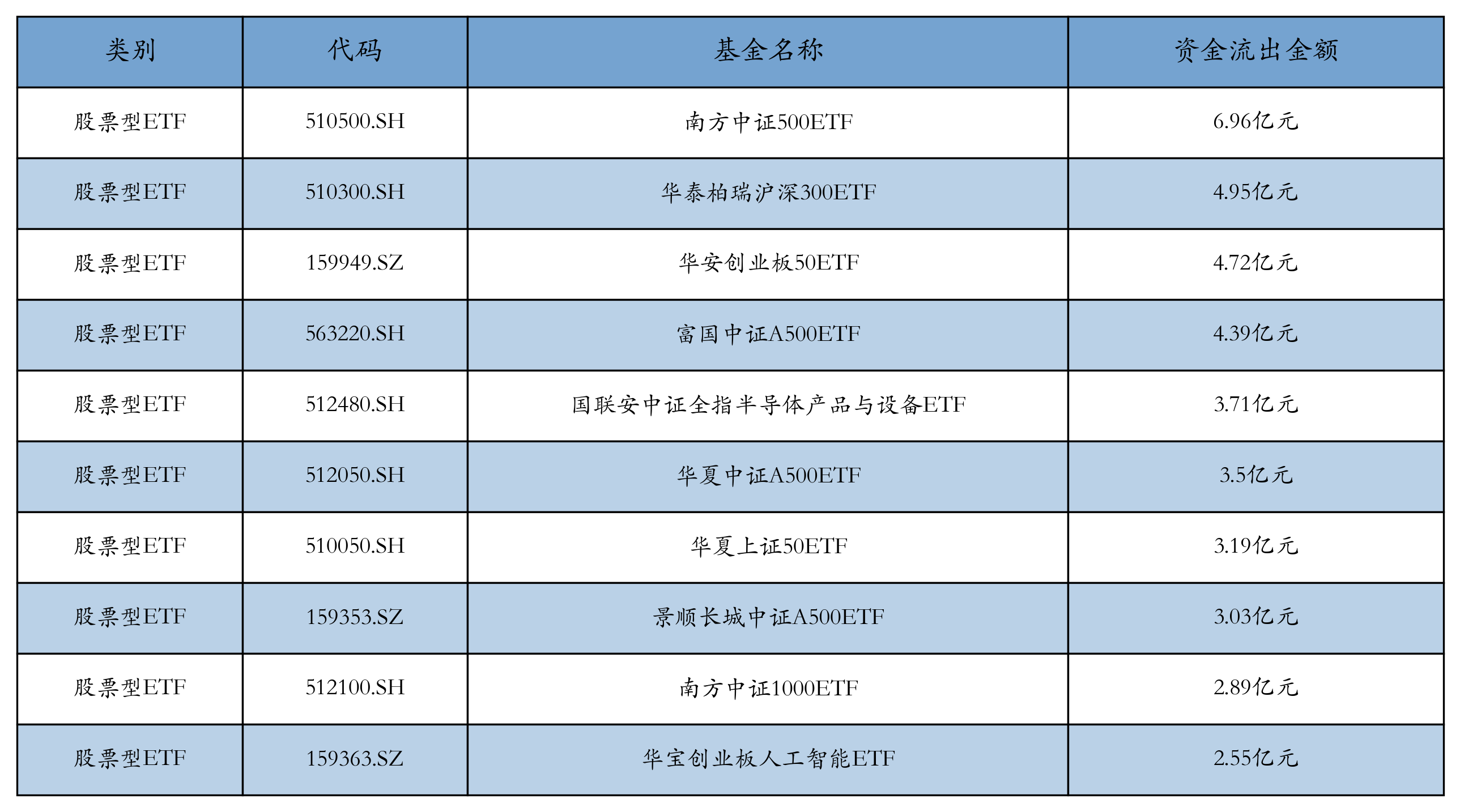 昨日股票型ETF资金流出最多的3支ETF及其流出金额分别为:南方中证500ETF(流出6.96亿元)、华泰柏瑞沪深300ETF(流出4.95亿元)、华安创业板50ETF(流出4.72亿元)。资金流出前10详情见下表: