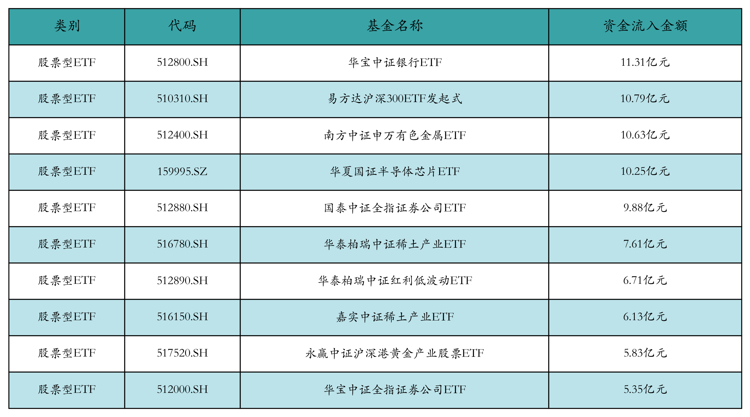 昨日股票型ETF资金流入最多的3支ETF及其流入金额分别为:华宝中证银行ETF(流入11.31亿元)、易方达沪深300ETF发起式(流入10.79亿元)、南方中证申万有色金属ETF(流入10.63亿元)。资金流入前10详情见下表: