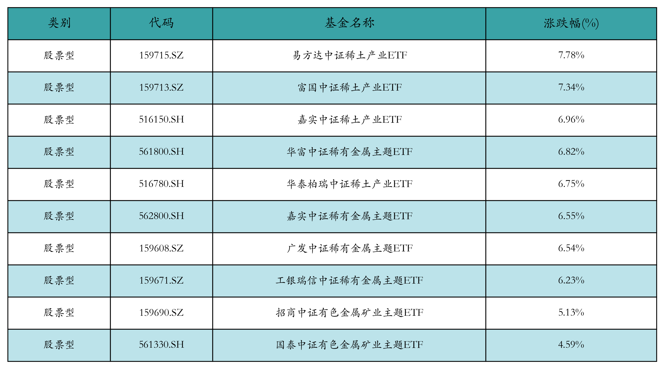 昨日股票型ETF涨幅最高的3支ETF及其收益率分别为:易方达中证稀土产业ETF(7.78%)、富国中证稀土产业ETF(7.34%)、嘉实中证稀土产业ETF(6.96%)。涨幅前10详情见下表: