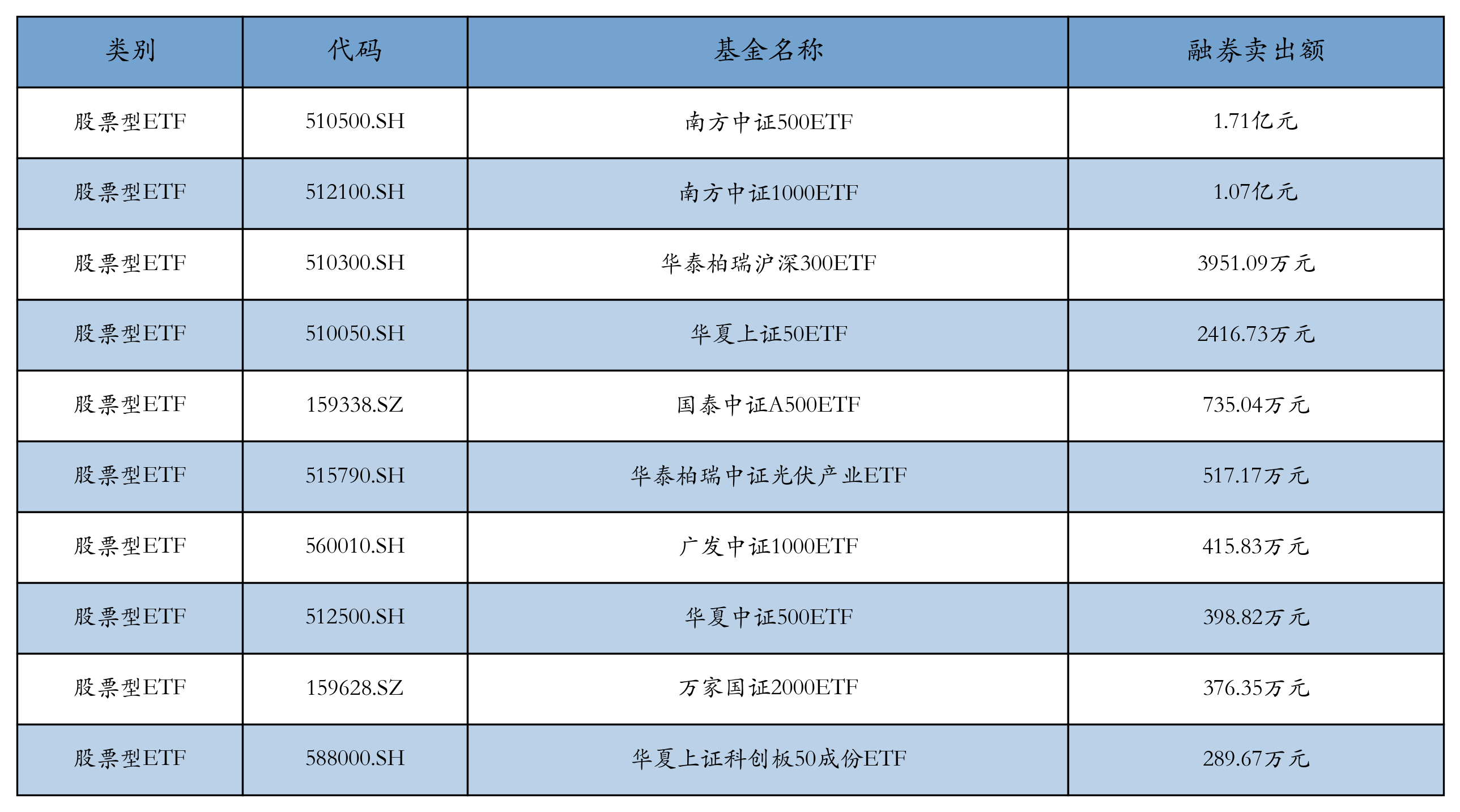 昨日股票型ETF融资卖出额最高的3支ETF及其卖出金额分别为:南方中证500ETF(1.71亿元)、南方中证1000ETF(1.07亿元)、华泰柏瑞沪深300ETF(3951.09万元)。融券卖出额前10详情见下表: