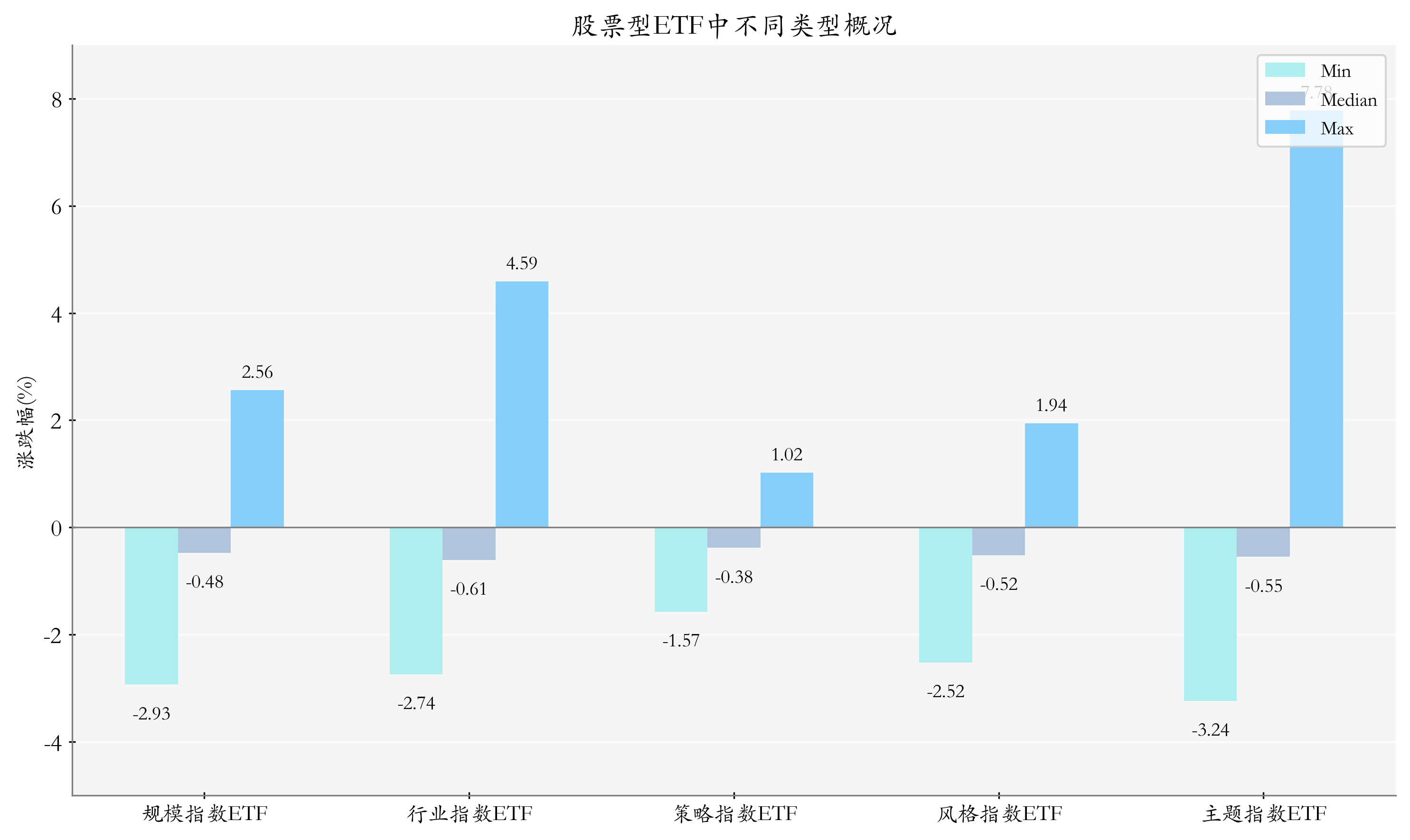 昨日股票型ETF收益率中位数为-0.49%。其中按照不同分类,规模指数ETF中南方上证科创板50成份增强策略ETF收益率最高,为2.56%;行业指数ETF中国泰中证有色金属矿业主题ETF收益率最高,为4.59%;策略指数ETF中华安中证全指自由现金流ETF收益率最高,为1.02%;风格指数ETF中银华中证500质量成长ETF收益率最高,为1.94%;主题指数ETF中易方达中证稀土产业ETF收益率最高,为7.78%。