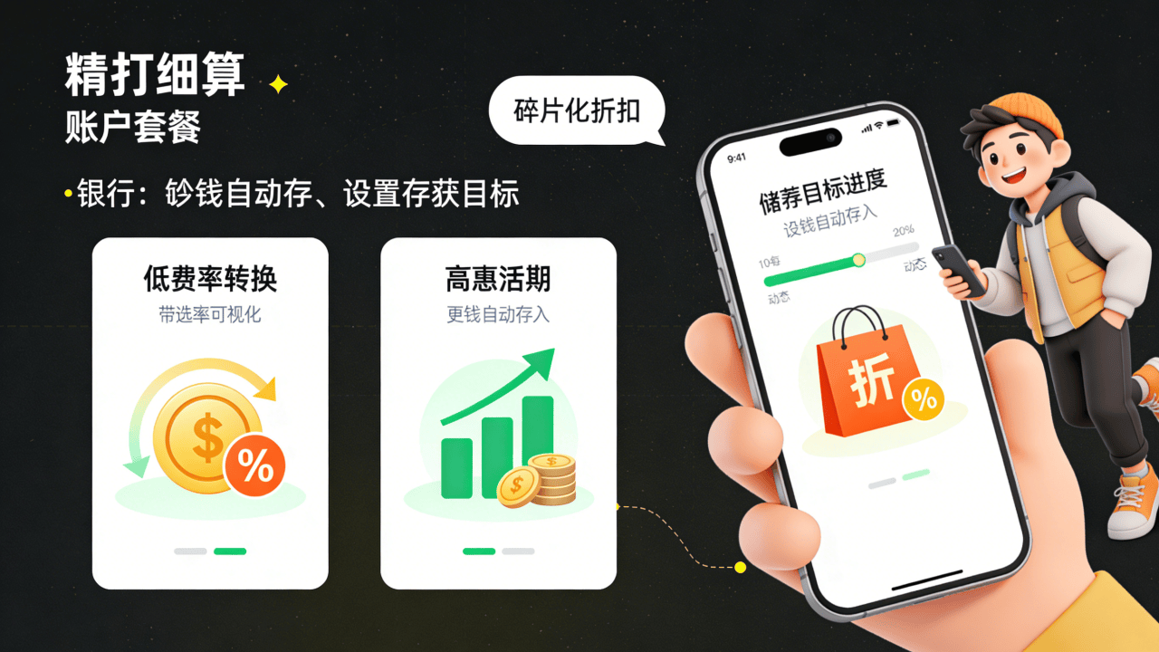 围绕“省钱、赚钱、省心”核心需求,整合金融产品,推出高性价比账户组合,用直观收益打动消费者。推出“精打细算”账户套餐,整合三大核心功能:一是低费率转账,本地跨行转账零手续费,异地转账费率打5折;二是高息活期,余额自动归集计息,收益比普通活期高30%;三是理财折扣,购买指定理财产品免申购费,并用可视化计算器展示“一年能省多少钱”——“每月转账5次,省30元;余额1万元,年多赚80元;买10万理财,省500元申购费,一年共省610元”,让性价比看得见、摸得着。