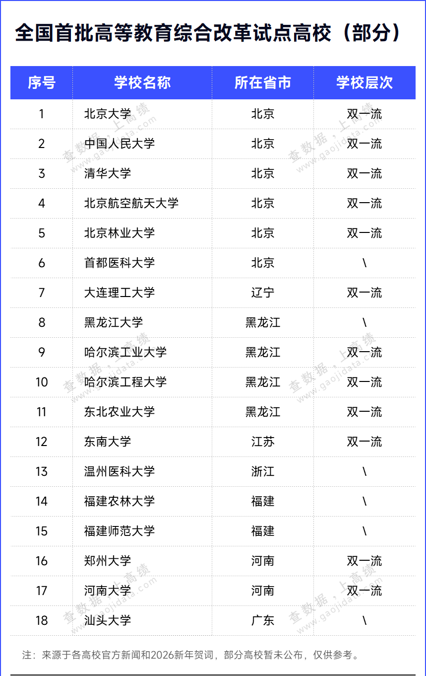 2026-01-06星空体育,星空体育官方网站,星空体育APP下载高绩收集了各高校官网新闻和2026新年贺词,截至目前,至少18所高校官宣入选首批高等教育综合改革试点高校,包括北京大学、中国人民大学、清华大学、哈尔滨工业大学等12所“双一流”高校和首都医科大学、黑龙江大学、温州医科大学、福建农林大学、福建师范大学、汕头大学等6所非“双一流”高校。