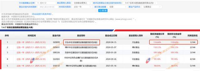 银河数据显示,天弘中证全指通信设备指数基金(A类:020899,C类:020900)A类份额全年收益率高达118.64%,C类份额收益率亦达118.21%,斩获2025年同类指数基金排名第一。(数据统计区间2025/1/1~2025/12/31,同类排名定义:标准主题指数股票型基金,共144只,收益数据已经托管行复核。)