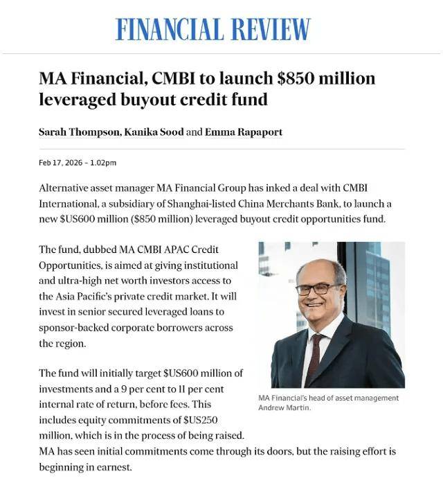 本网从美驰澳大利亚公司获悉,2026年2月16日MA美驰澳大利亚与招银国际( CMB International )达成战略合作,联合推出目标规模6亿美元、面向机构及超高净值投资者的亚太信贷投资产品。