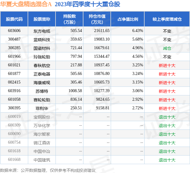 华夏大盘精选混合A为混合型-灵活基金,根据最新一期基金季报显示,该基金资产配置:股票占净值比86.45%,债券占净值比5.83%,现金占净值比3.78%。基金十大重仓股如下: