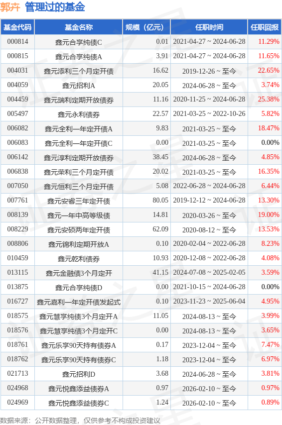 郭卉女士:中国,经济学硕士研究生。相关业务资格:证券投资基金从业资格。历任国海证券深圳总部管理培训生、东海证券研究所固定收益研究员、常熟农村商业银行债券投资经理。2019年6月加入鑫元基金历任基金经理助理,现任基金经理。2019年12月12日至2024年6月28日担任鑫元安睿三年定期开放债券型证券投资基金的基金经理。2019年12月26日担任鑫元添利三个月定期开放债券型发起式证券投资基金基金经理。2020年3月26日起任鑫元一年定期开放中高等级债券型证券投资基金基金经理。2020年8月12日起担任鑫元安硕两年定期开放债券型证券投资基金的基金经理。2020年11月25日至2024年6月28日担任鑫元瑞利定期开放债券型发起式证券投资基金基金经理。2021年3月25日起任鑫元荣利三个月定期开放债券型发起式证券投资基金基金经理。2021年3月25日起任鑫元全利债券型发起式证券投资基金基金经理。2021年4月27日至2024年06月28日担任鑫元合享纯债债券型证券投资基金基金经理。2022年6月28日至2024年6月28日担任鑫元恒利三个月定期开放债券型发起式证券投资基金基金经理。曾任鑫元乾利债券型证券投资基金的基金经理。2023年11月23日至2025年6月4日担任鑫元嘉利一年定期开放债券型发起式证券投资基金基金经理。2024年06月28日起任鑫元淳利定期开放债券型发起式证券投资基金、鑫元招利债券型证券投资基金基金经理。2024年08月13日起任鑫元慧享纯债3个月定期开放债券型证券投资基金基金经理。